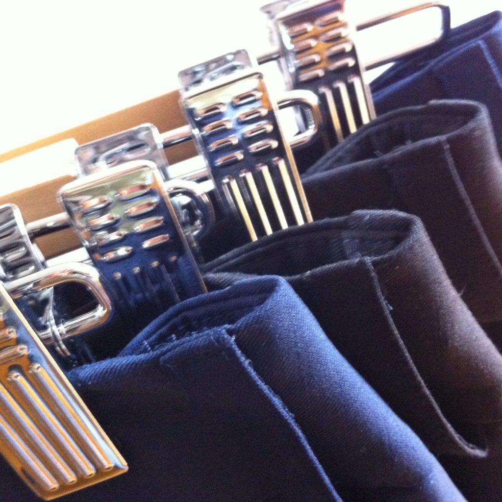 Wir haben uns für Nadelstreifen entschieden; dank der feinen Linien kann man am fertigen Kleidungsstück den Fadenverlauf schön nachvollziehen und den letzten Feinschliff anbringen. Dafür muss ich ganz exakt arbeiten, denn die Linien müssen bei den aneinander genähten Teilen haargenau aufeinander treffen. In einem Dokumentarfilm über Karl Lagerfeld hat eine Schneiderin gesagt, sie müssten auf einen Millimeter genau arbeiten. Damals habe ich geschmunzelt. Heute konzentriere ich mich.