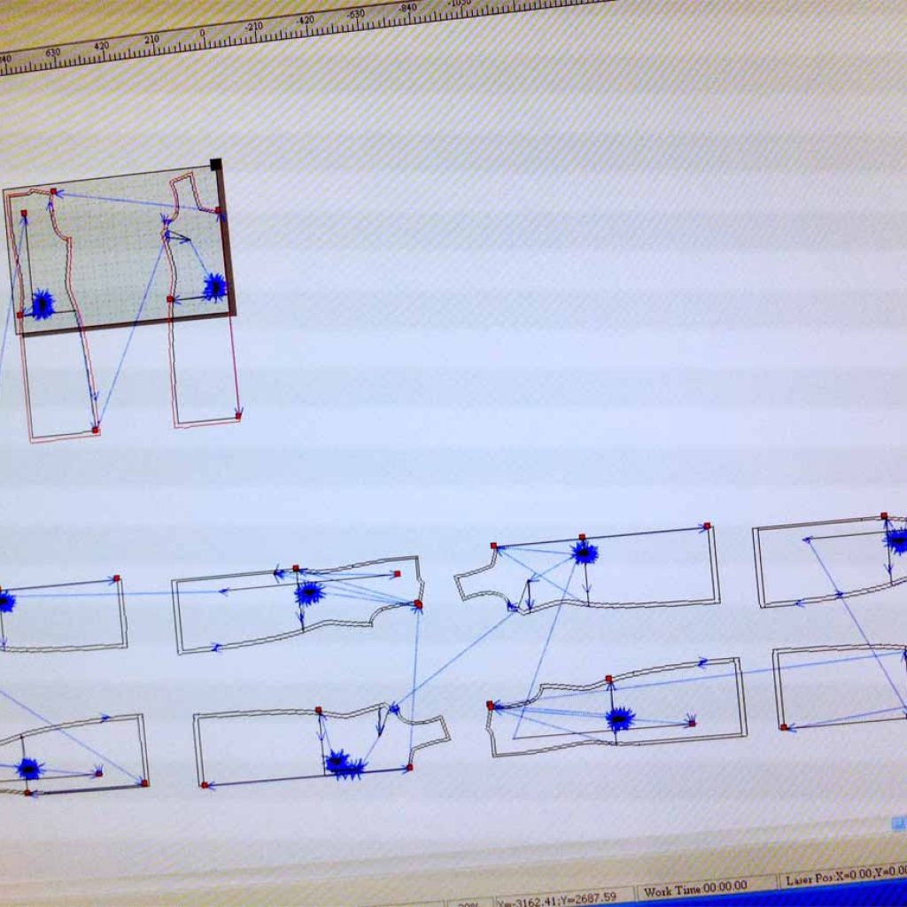 Nicht nur die Genauigkeit der Schnitte muss auf den Millimeter stimmen, auch die Geschwindigkeit und der Druck des Lasers müssen eingestellt werden und sind für ein brauchbares Resultat entscheidend. Mit wenig Druck und hoher Geschwindigkeit wird der Karton nur angeschwärzt, sprich Nahtlinien, Fadenlauf und Beschriftung eingezeichnet. Bei hohem Druck und geringerer Geschwindigkeit wird der Karton durchgebrannt, also geschnitten. Sobald Druck und Geschwindigkeit auf die Kartondicke abgestimmt sind, kann es losgehen: Die Schnitteile werden tage- und nächtelang vom Lasercutter gezeichnet und ausgeschnitten. Wie lange das dauert? Pro Schnittteil dauert es 3 bis 5 Minuten fürs Einspannen des Kartons, das Positionieren, das Markieren der Naht- und Schnittlinien und das Lasern. Wir haben über 900 Schnittteile produziert. Rechne!